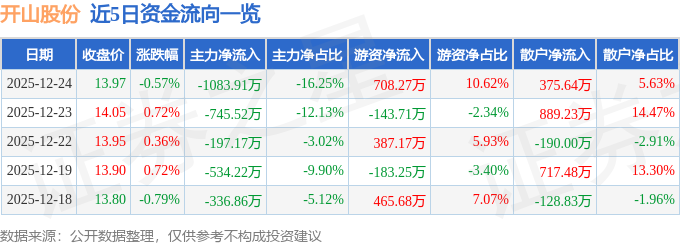 证券之星消息◇,截至2025年12月24日收盘□▷,开山股份(300257)报收于13◆.97元,下跌0□.57%,换手率0.5%,成交量4.76万手,成交额6671▽.22万元。