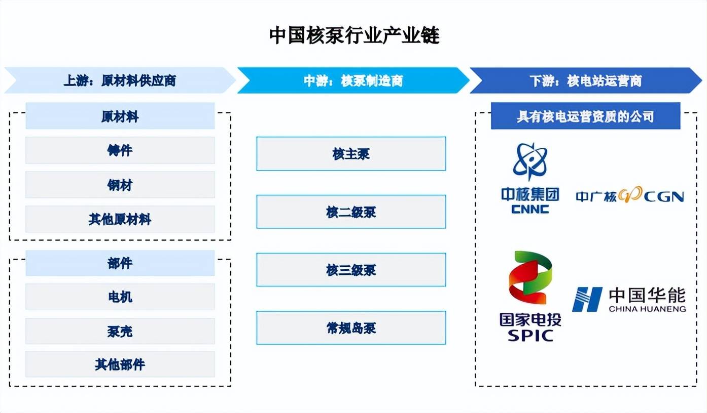 核泵产业链覆盖了上游的铸件、钢材等原材料与电机、泵壳等部件的供应,通过中游不同类型核电用泵的研发▽•、制造与测试◆▷,最终供给下游核电站建设及运营=■。