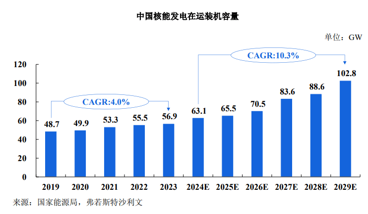 随着我国经济的快速发展和能源需求的不断增加…,核电作为一种高效▪…、清洁的能源形式,逐渐成为国家能源结构优化的重要方向。根据弗若斯特沙利文《中国核泵市场研究报告》,中国核能发电在运装机容量由 2019 年的 48.7GW 增长至 2023 年的56…◁.9GW•◇,期间年复合增长率为 4△●●.0%。预计未来,随着我国在建核电站逐步完成建设投入商运,我国核能发电在运装机容量有望从 2024 年的 63.1GW 增长至 2029 年的102.8GW△=◁,期间年复合增长率为 10=▽.3%。