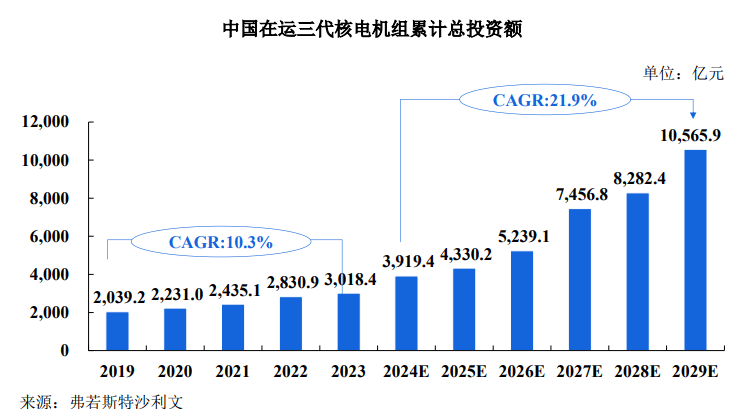 由于核电项目建设周期较长☆◆,每年新增机组数量波动较大,故通常以累计核电机组作为统计基础▽-•,以剔除建设周期带来的波动,更好地反映行业真实情况,根据弗若斯特沙利文《中国核泵市场研究报告》,中国在运三代核电机组累计总投资额从 2019年的 2,039◇.2 亿元增长至 2023 年的 3,018▷■□.4 亿元,期间年复合增长率为 10★○.3%,预计未来随着更多在建三代核电机组投入商运,其累计总投资额有望从 2024 年的 3,919△◆•.4 亿元,增长至 2029 年的 10,565.9 亿元,期间年复合增长率为 21.9%。