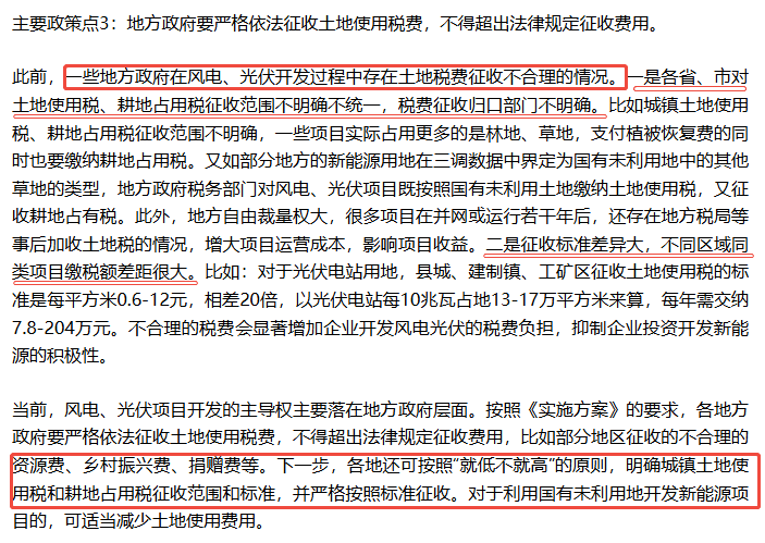 税收问题是光伏行业老生常谈的问题。2023年国家能源局曾发布《关于促进新时代新能源高质量发展的实施方案案例解读》第四、五章◁▷☆,解读中提到了光伏税收面临的问题,并提到各地可按照“就低不就高”的原则=○,明确城镇土地使用税和耕地占用税征收范围和标准,并严格按照标准征收★▲◇。