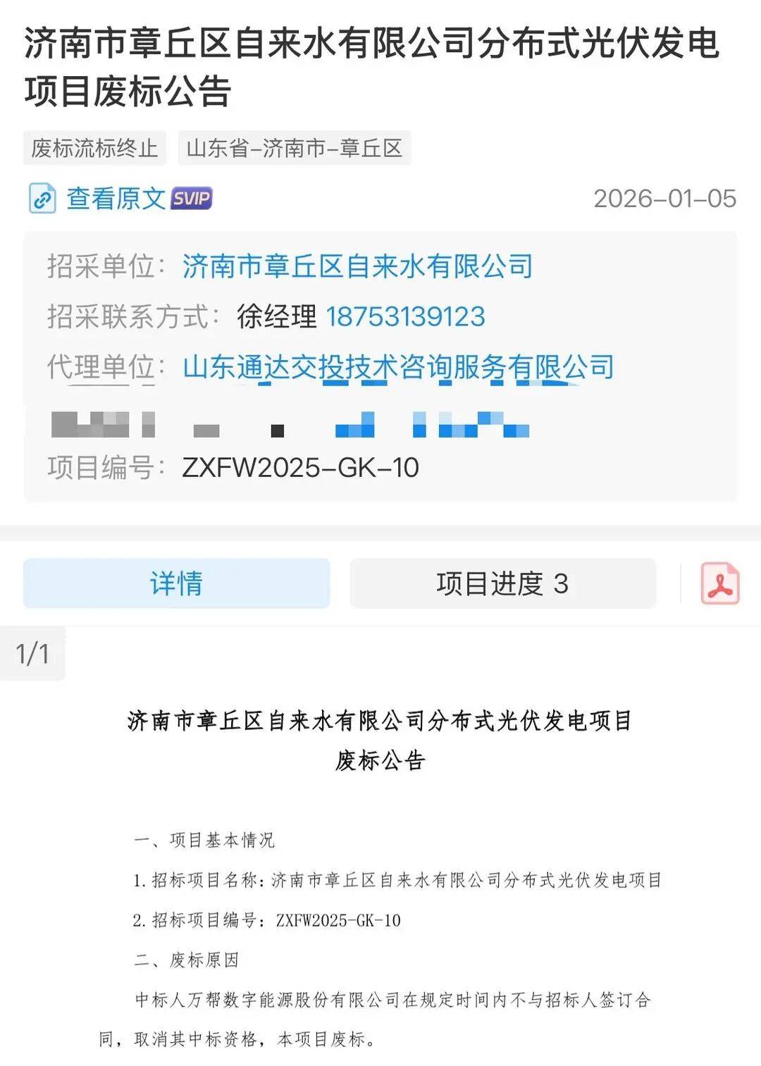 1月5日,济南市章丘区自来水有限公司发布分布式光伏发电项目废标公告称,中标人万帮数字能源股份有限公司在规定时间内不与招标人签订合同,取消其中标资格,项目废标••。