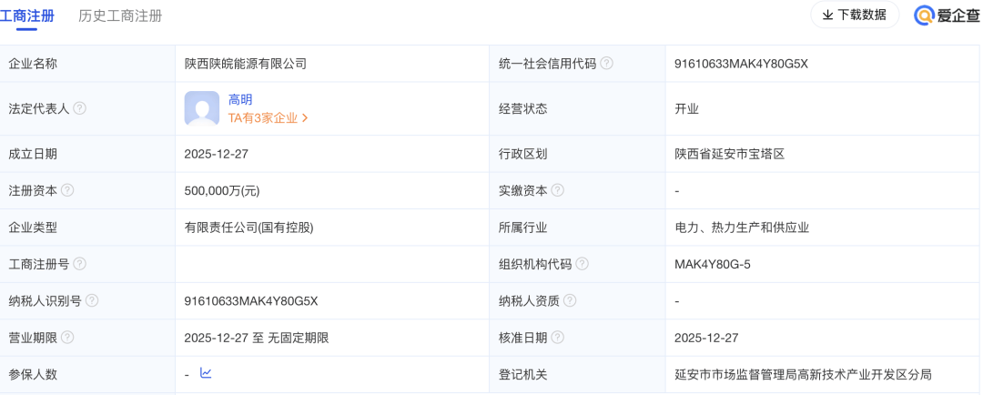 近日▲…▼,陕西陕皖能源有限公司在陕西省延安市成立…▷☆,出资高达50亿元◁▽,法定代表人为高明▷▪。该企业由大唐集团、延长石油=○、皖能集团等央国企合资成立。