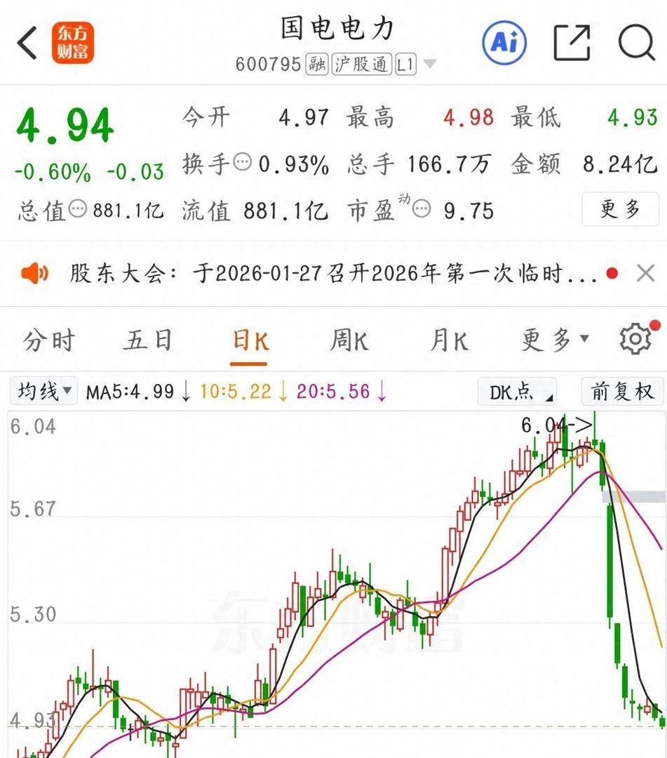 沪指一路高歌猛进▼★,冲破4100点◆◁,市场沉浸在十六连阳的狂热中。 然而,就在这片满屏红色的海洋里,国电电力这艘大船却独自下沉★…-,走势冰冷得刺眼。 从2025年12月25日开始,整整十个交易日,它有九天的收盘价都是下跌的。 股价从6.04元的巅峰,迅速跌回了四个月前的水平,累计跌幅超过18%★。 那些在12月中下旬★◇,尤其是股价顶峰附近冲进去的投资者,账户经历了从喜悦到绝望的急速转变•◁●。 一位在12月19日首次建仓,并在随后几天持续加仓的股民,其亏损在短时间内迅速扩大◁●。