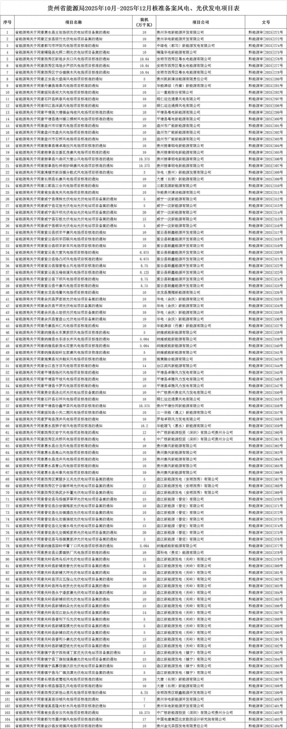 根据《省人民政府关于印发贵州省企业投资项目核准和备案管理办法的通知》(黔府发〔2018〕第7号),按照程序,贵州省能源局2025年10月-2025年12月核准备案风电◆▪●、光伏发电项目105个,现将有关情况公布如下。