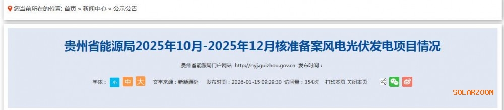 1月15日,贵州能源局发布2025年10月-2025年12月核准备案风电光伏发电项目情况。