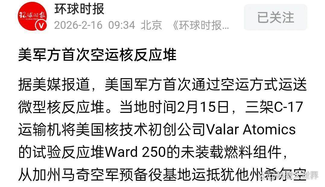 据《环球时报》、财联社等媒体援引美媒的报道,今年年2月15日,美国军方出动三架C-17运输机,将Valar Atomics公司研发的Ward 250试验反应堆从加州马奇空军预备役基地运至犹他州希尔空军基地,后续将送往实验室开展测试评估。此次行动并非单纯的军事技术试验,而是为落实美国核能发展与月球探索战略的关键一步,这一核反应堆的技术成果将直接为2030年前月球永久前哨站核能源供应体系铺路,或者说该型核反应堆未来将在月球基地部署。